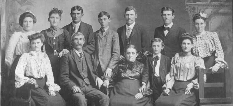 Front row: Mary Elijahetta Haskell 14, Thales Hastings Haskell 51, Margaret (Edwards) Haskell 50, Ashbel Greene Haskell 13, and Maret Ann (Haskell) Smith 20. Back row: Sarah Francelle (Haskell) Derrick 19, Johanna Maria (Haskell) Harrison 26, Benjamin Harrison 27, Thales Haskell Jr. 16, Jesse H. Smith 27, Albert R. Smith 23, Irene Ursulia (Haskell) Smith 23. Photo courtesy of Kris Johnson